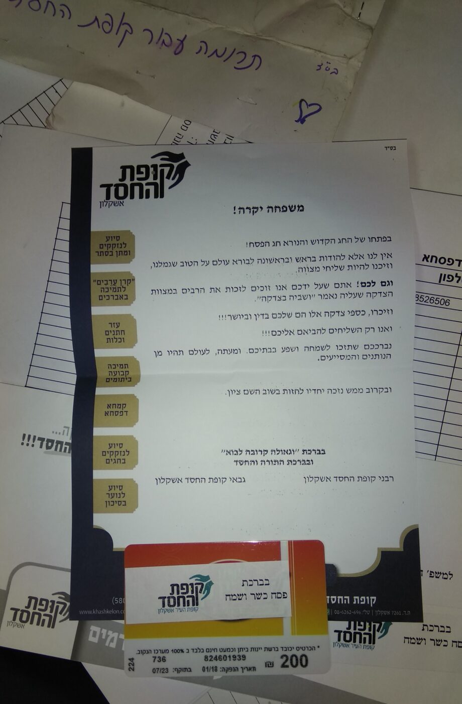 ואין לנו רבני הקהילות, ראשי הכוללים, ועשרות משפחות מהעיר אשקלון, אלא להודות לכם כלל תורמי קופת החסד – קופת העיר אשקלון, על כך שבזכותכם מאות מתושבי העיר יכלו לחוג את חג הפסח בצורה יותר מכובדת.