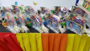 בשעות הבוקר המאוחרות הגיעו הילדים יחד עם האמהות והופתעו לגלות שולחן ערוך בכל טוב, הפתעות ומתנות, ממתקים ופינוקים לכולם.
