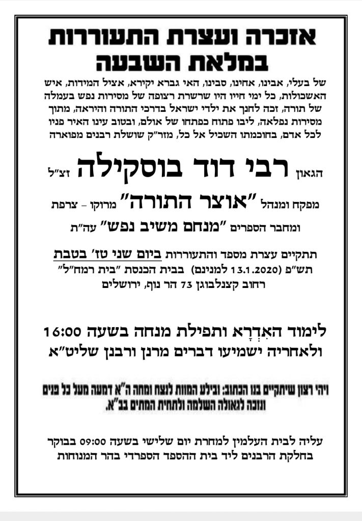 המונים ובראשם גדולי תורה רבנים וקהל רב ליוו למנוחות תחת גשמי ברכה את הרב הגאון רבי דוד בוסקילה זצ"ל מנהל ומפקח מוסדות "אוצר התורה" במרוקו ובצרפת שנסתלק ביסורין קשים כשהוא בן פט' שנים.