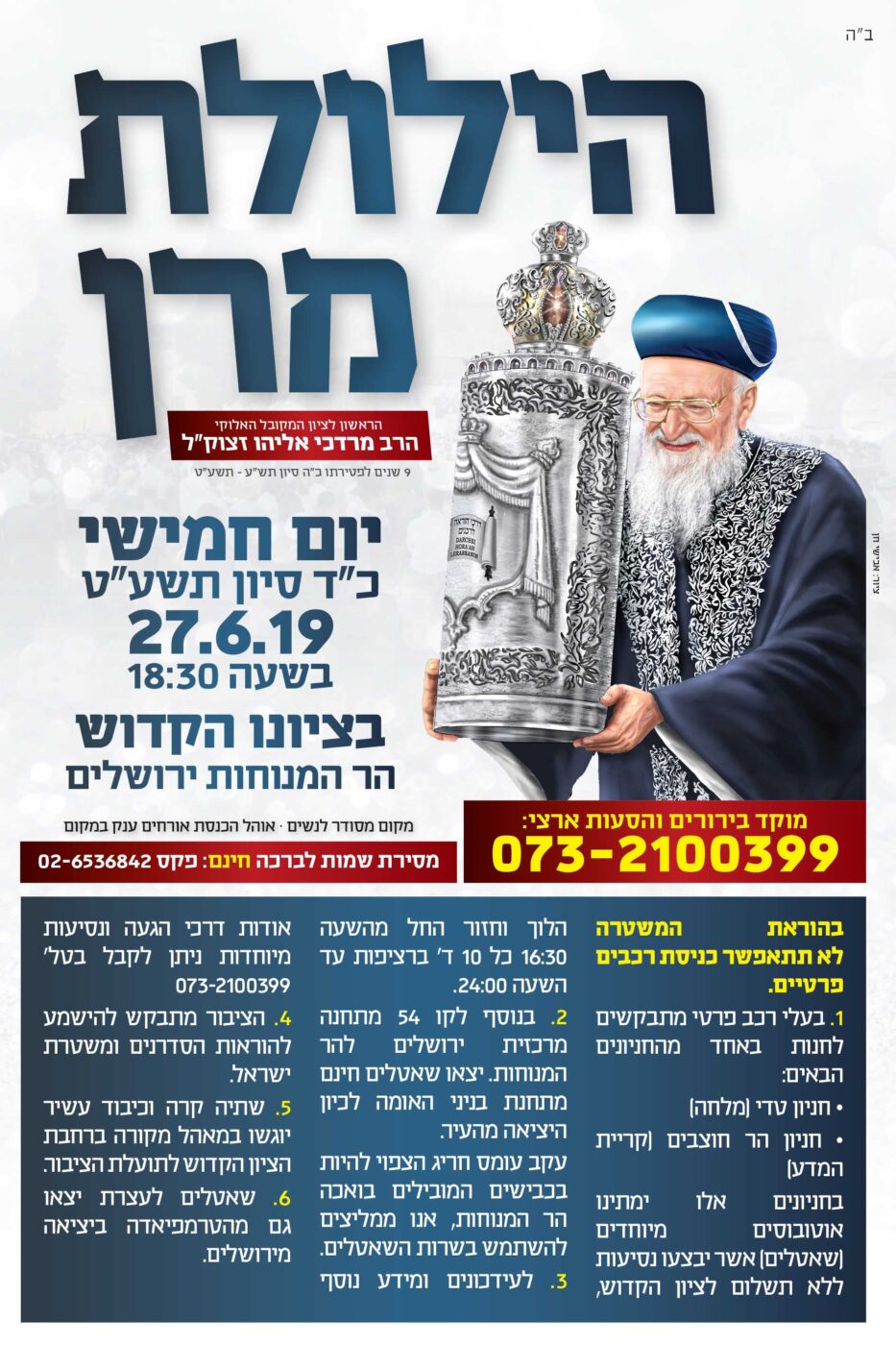 בשבוע הבא ביום חמישי יחול יום ההילולא של מרן זצ"ל ובמוסדות הרב –"דרכי הוראה לרבנים" לא מפספסים אף רגע וכבר מעכשיו ההכנות למעמד ההילולא תשע"ט בעיצומן, גדולי וחשובי הרבנים שליט"א הודיעו כי ישתתפו במעמד התפילה העוצמתי שכבר התפרסם ברחבי הארץ והעולם כולו כמסוגל מאד לישועות, במוקד הטלפוני המיוחד מתקבלות מדי יום מאות פניות מכל רחבי הארץ מאנשים המבקשים להתעדכן אודות ההסעות ודרכי ההגעה השונים ויש גם כאלה המעדכנים כי הם לא יוכלו להגיע אך לא מוותרים על הזכות ששמם יוזכר בציון הקדוש ביום ההילולא המיוחד ולכן מבקשים שאברכי הכולל יתפללו בעבורם, גם מערך הלוגיסטיקה האמון על אהל הכנסת האורחים שיהיה במקום נערך עם עשרות אלפי ליטר שתיה קרה אלפי ארטיקים צוננים מאות קילו מאפים לתועלת הציבור הענק שיברך לכבוד הצדיק זצ"ל .