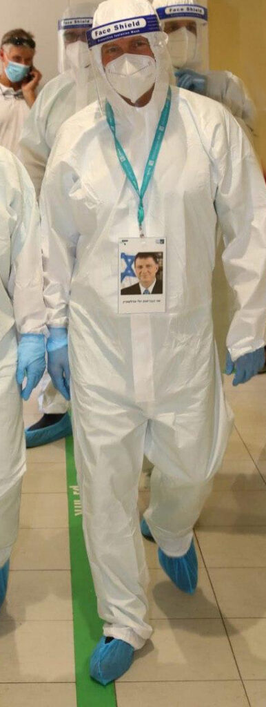 במהלך שהותו במחלקה השר לבש את המיגון הנדרש למי שנכנס למקום: סרבל מגן, מסכה n95, ערדליים, מסכת מגן פלסטיק, כובע וכפפות. בנוסף לערכת המיגון, השר ענד תג עליו מתנוססת תמונתו, בדומה לנהוג בקרב עובדי המחלקה, על מנת שהחולים במחלקה יוכלו לזהותו.